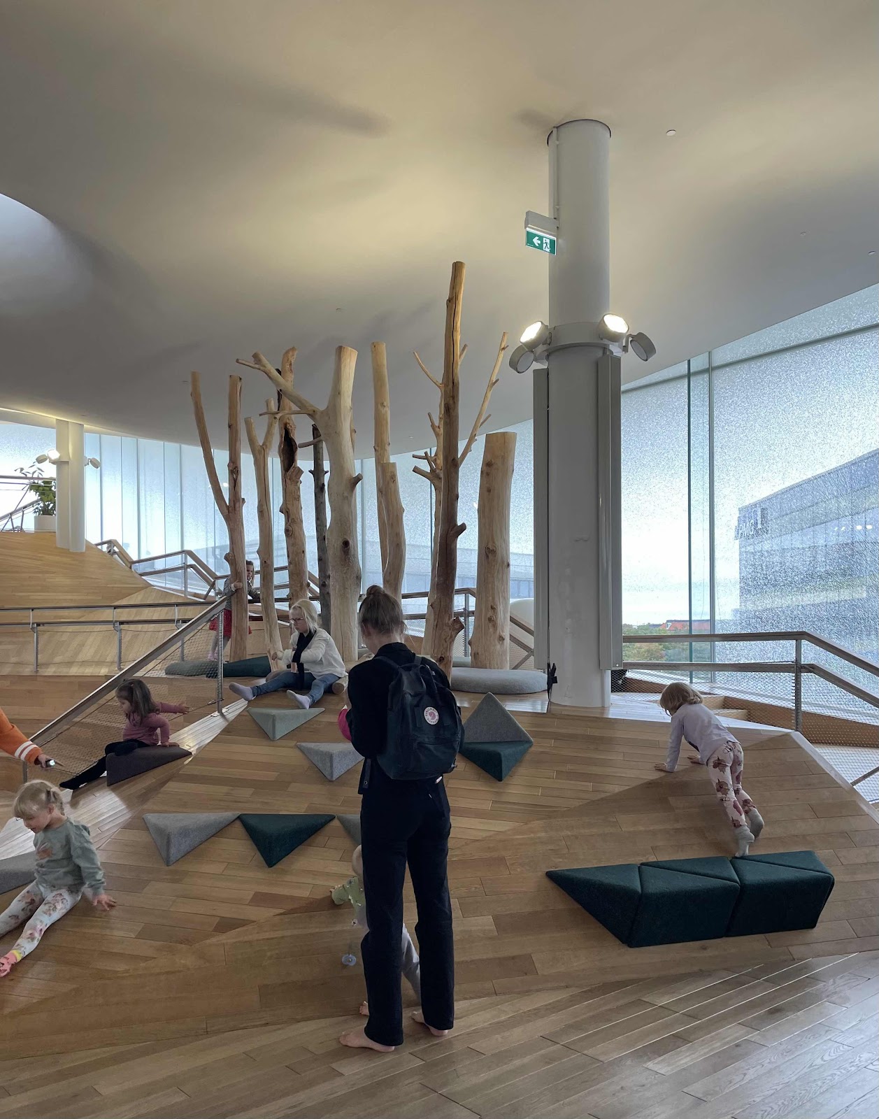 Here you can read under a ceiling that resembles clouds, stop by for coffee, play with your children or grandchildren and admire the surrounding city.