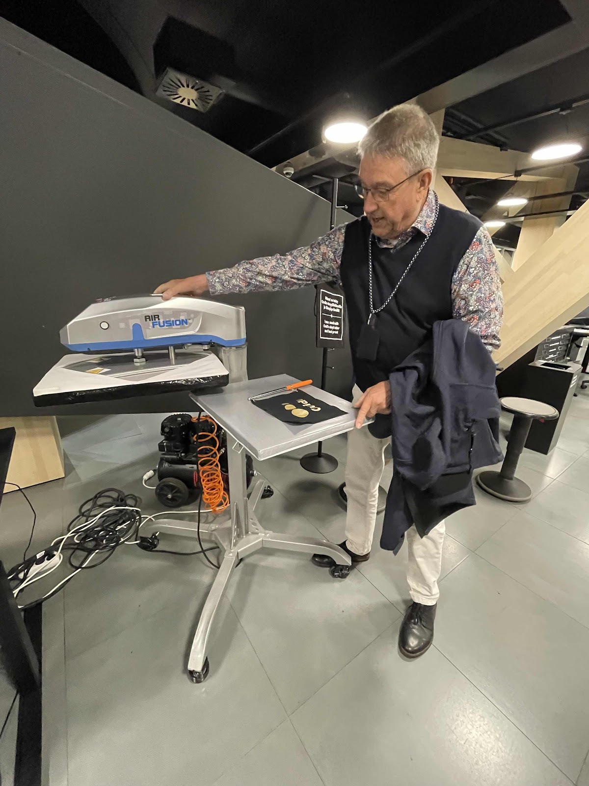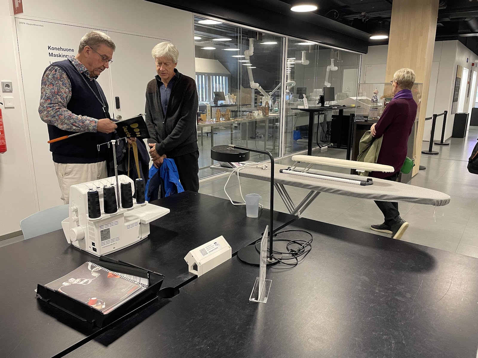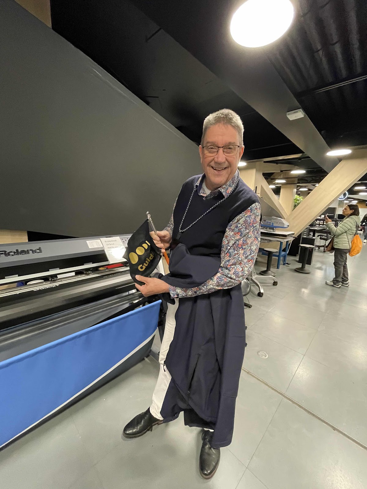 The second floor has 3D printers, a laser cutter, UV printer, a large format printer, a vinyl cutter, and serger sewing machines. Niko showed us how he designed and created the guide flags he uses when he leads groups.
